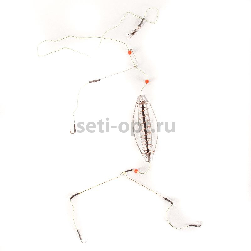 Донный монтаж с кормушкой "Арбуз" оборудован двумя "коромыслами" и тремя прочными крючками. В качестве лески используется плетеный шнур Power Pro диаметром 0,22 мм. Все узелки закрыты термоусадочными трубочками, что бы при забросе не было перехлестов и запутываний оснастки.
