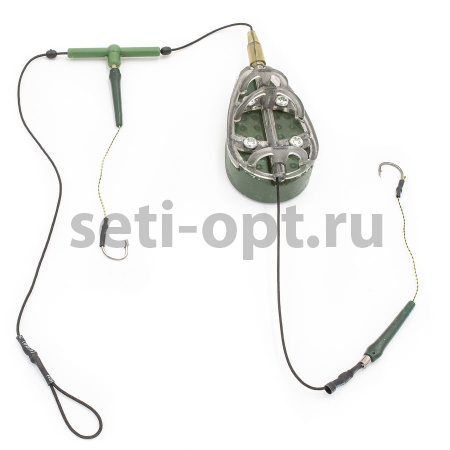 Монтаж предназначен для ловли рыбы донной снастью, допускает использование бойлов. Кормушка весом 70гр, два крючка.