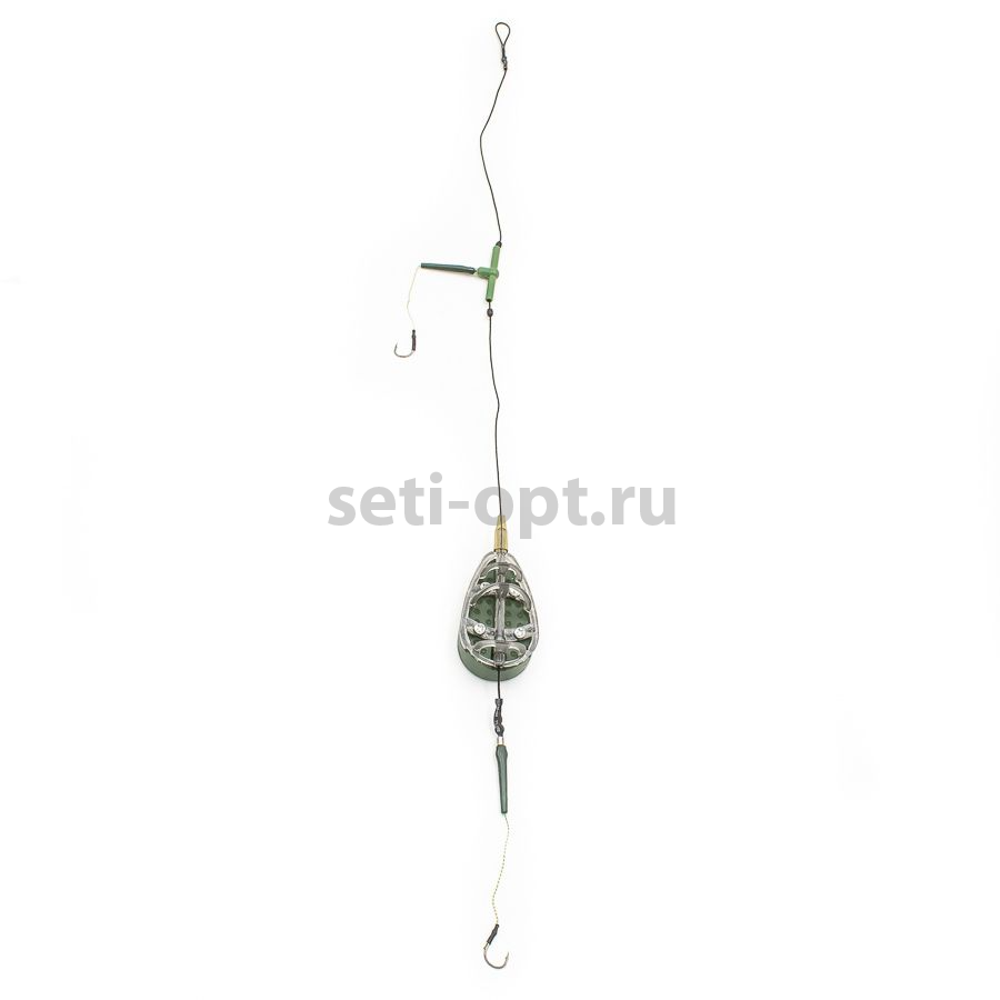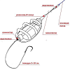 Монтаж предназначен для ловли рыбы донной снастью, допускает использование бойлов. Кормушка весом 80гр, два крючка.