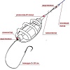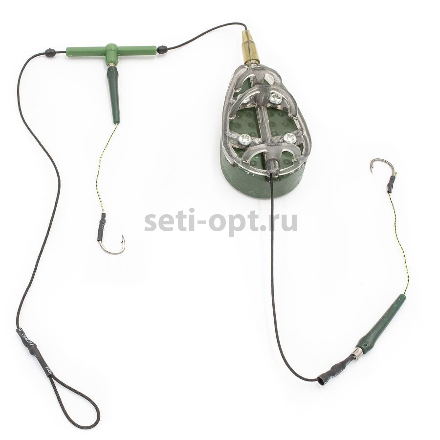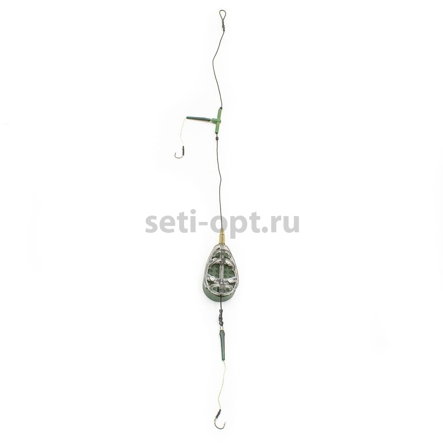 Монтаж предназначен для ловли рыбы донной снастью, допускает использование бойлов. Кормушка весом 90гр, два крючка.