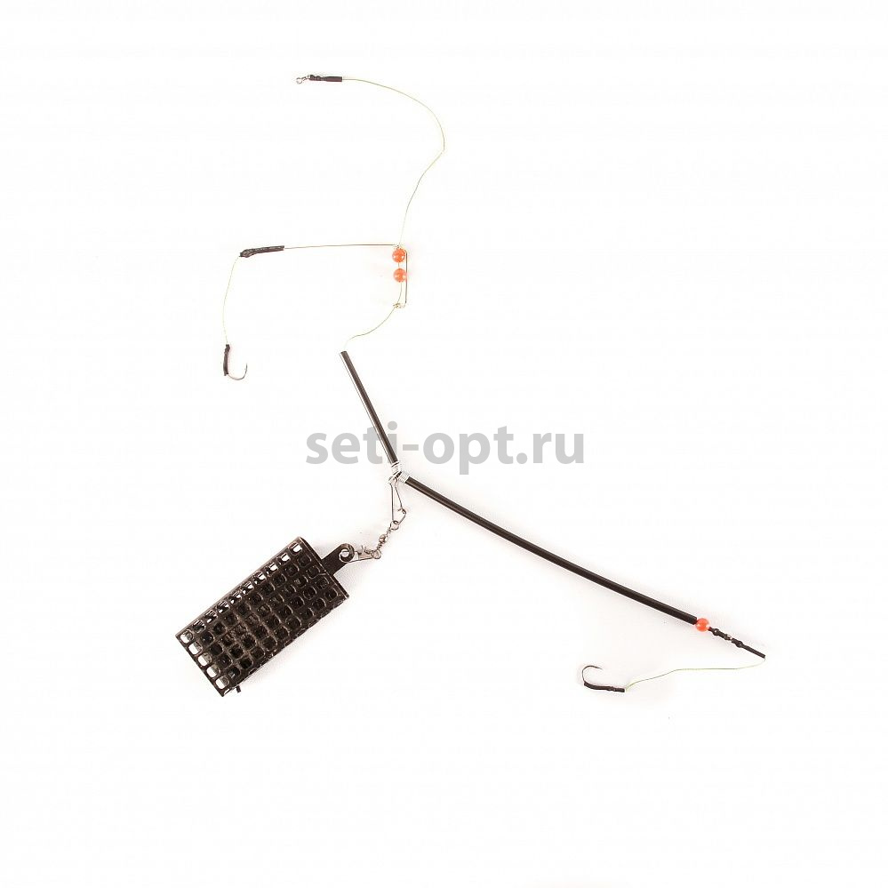 Донный монтаж с фидерной кормушкой оборудован анти-закручивателем, стальным коромыслом и двумя прочными крючками. В качестве лески для поводков используется плетеный шнур Power Pro диаметром 0,22 мм. Все узелки закрыты термоусадочными трубочками, что бы при забросе не было перехлестов и запутываний оснастки.