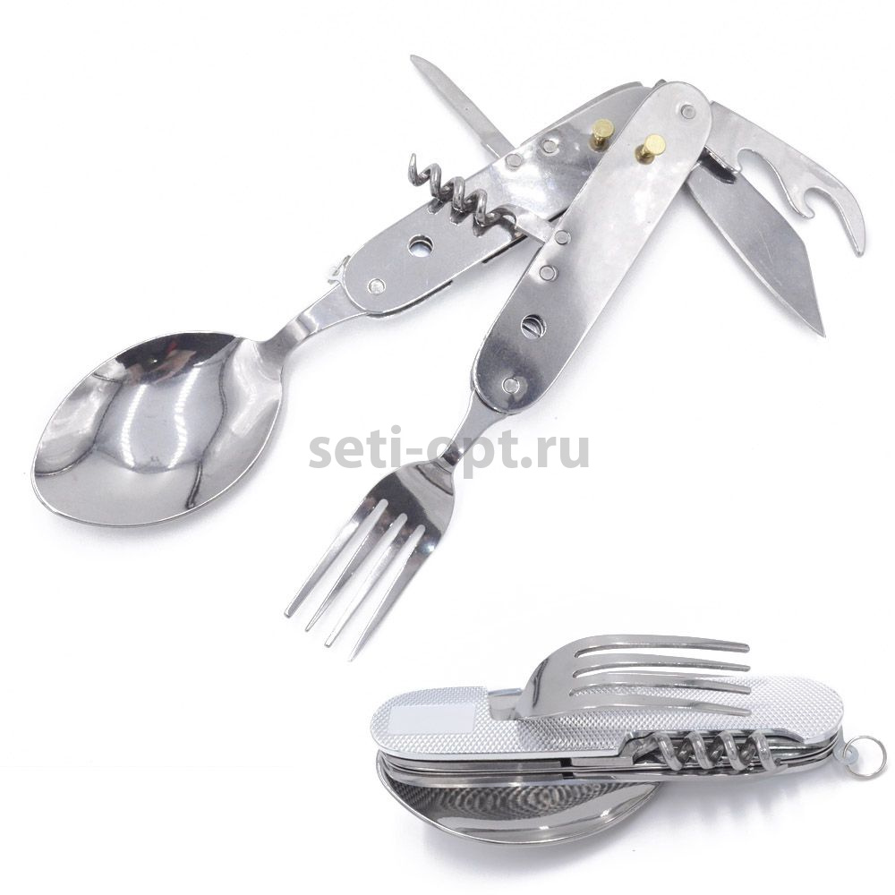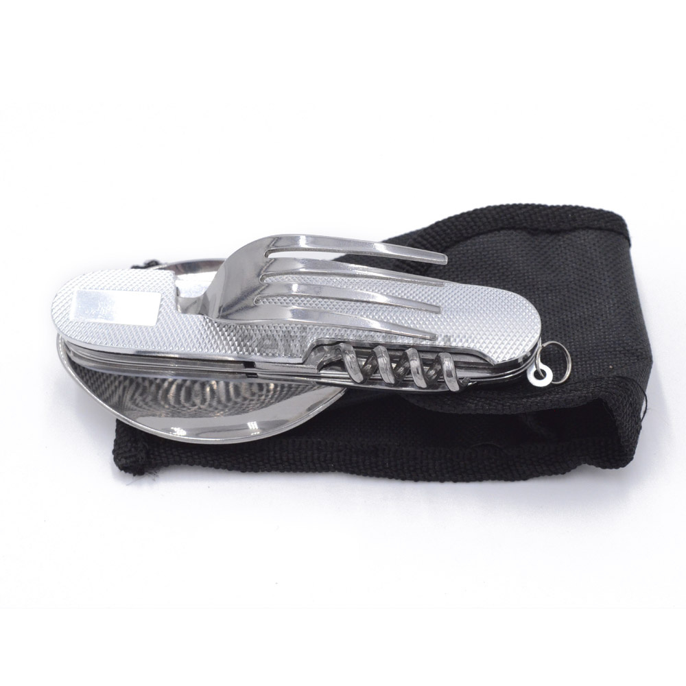 Комплект туриста со столовыми приборами - отличное решение для повседневных хозяйственных работ и туристических походов. Все инструменты из высококачественной нержавеющей стали. Длина: 11 см, вес: 140 гр.