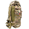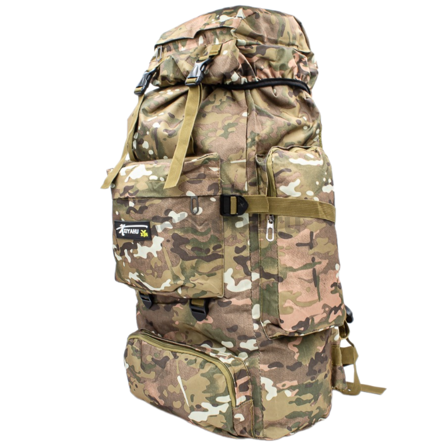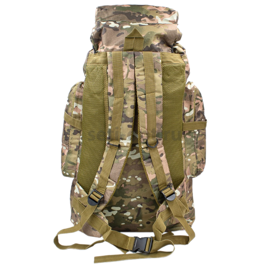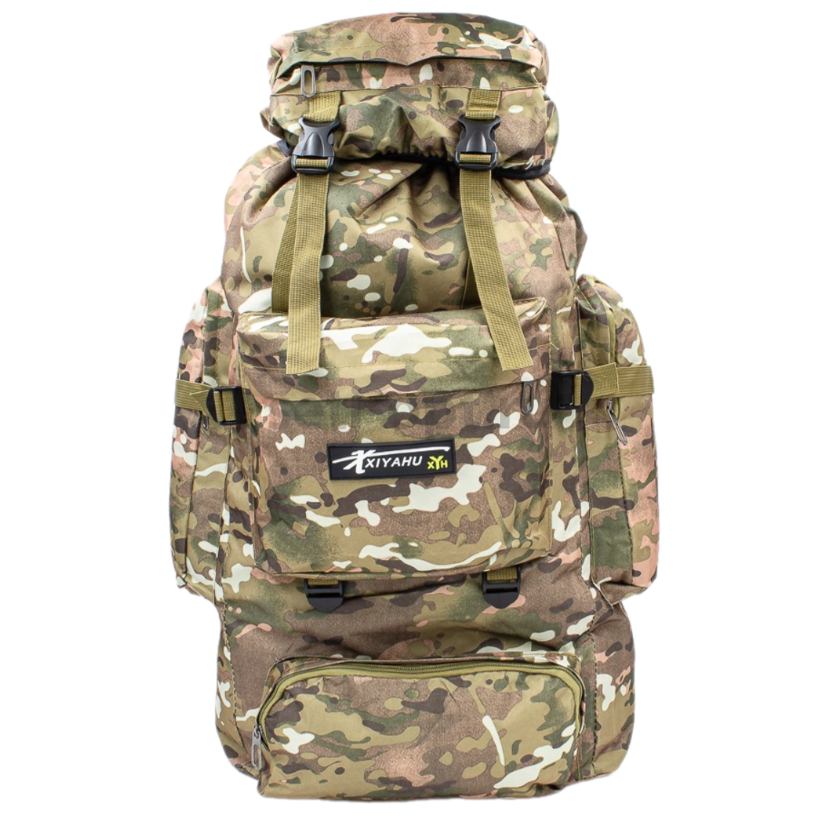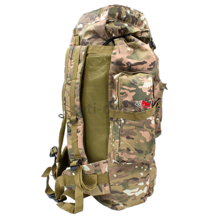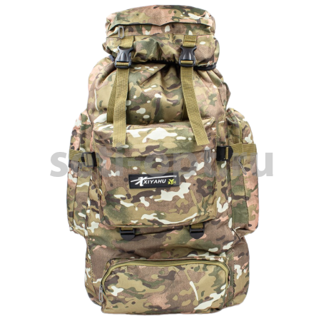 Рюкзак туристический с дополнительными стропами.  Затягивающийся основной большой отсек, верхняя часть закрывается клапаном для принадлежностей и снаряжения на застежках. Рюкзак выполнен из прочной водоотталкивающей и водонепроницаемой ткани оксфорд. Мягкие ручки регулируются по длине с помощью строп. Рюкзак имеет одно большое основное отделение, два кармана на молнии спереди, два кармана по бокам на молнии, один карман в клапане рюкзака.