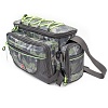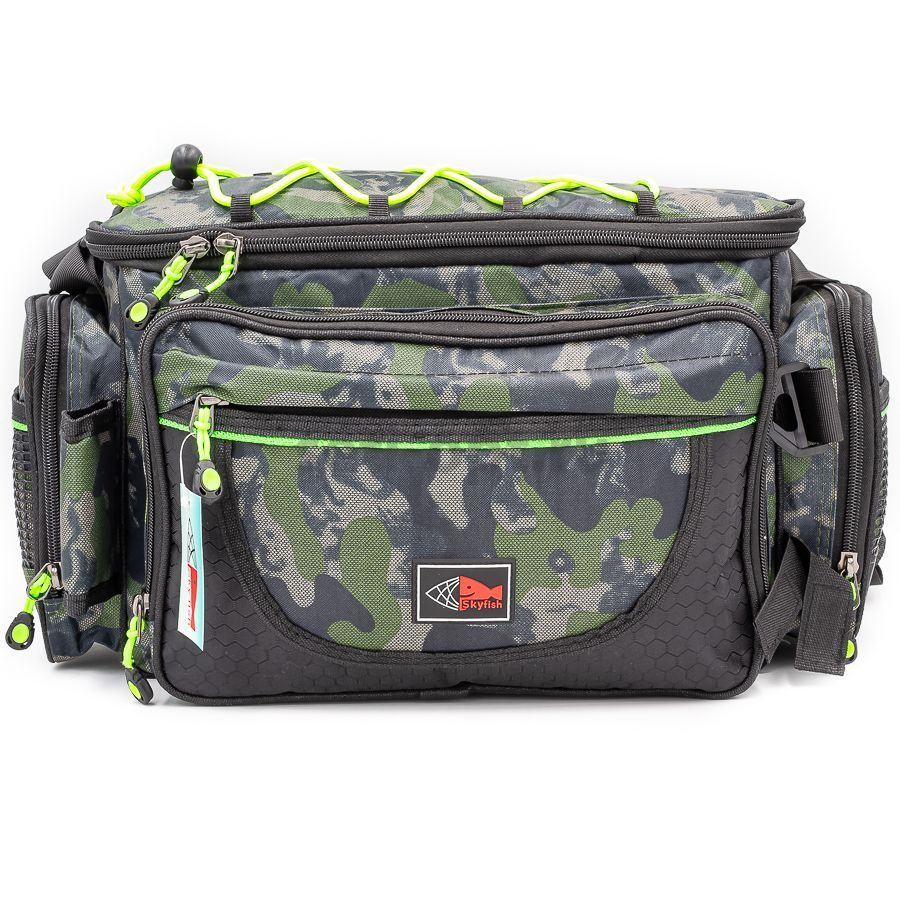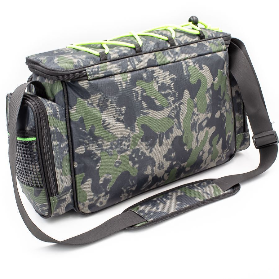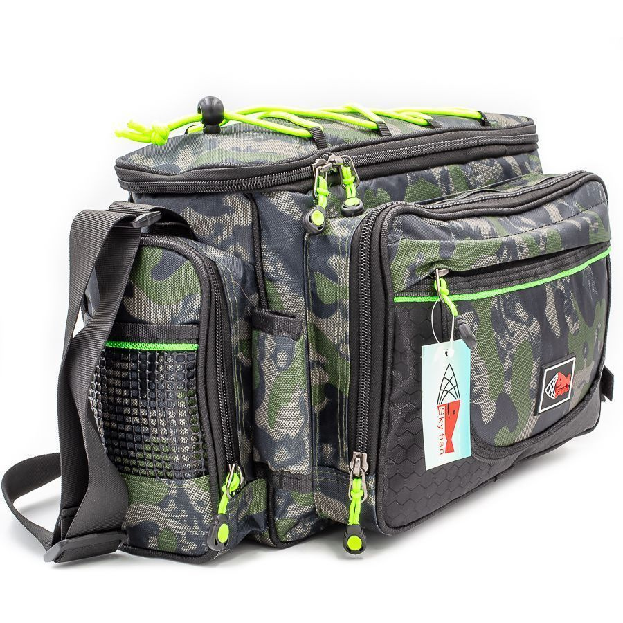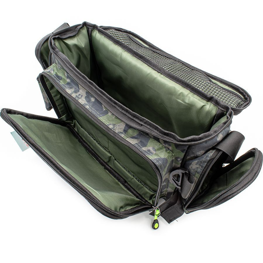 Универсальная рыболовная сумка прекрасно подойдет для рыболовных принадлежностей и мелких аксессуаров. Вы всегда сможете носить в ней все необходимые для рыбалки вещи: коробочки для снастей, катушки, рыболовный инструмент.  Закрывается основное отделение с помощью крышки на молнии, с внутренней стороны которой предусмотрены небольшие  кармашки-сеточки, с внешней стороны стяжка для дополнительных вещей. Спереди сумки  расположены: 1 объемный карман и один небольшой кармашек. Оба кармана на молнии. С боков один вместительный карман на молнии и  один кармашек-сеточка.  Сумка оснащена надежным наплечным ремнем.